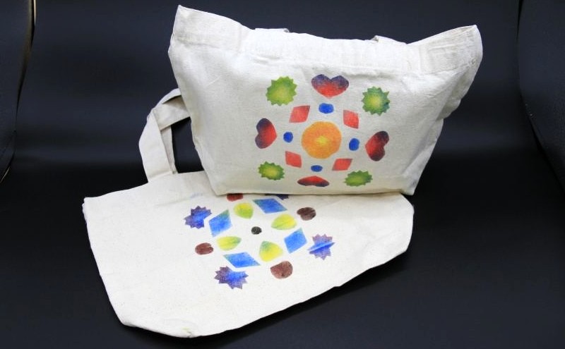 「切り絵」の要領で事務用シールシートをたたみ、印を書いたところをハサミで切り抜いて広げると連続模様の「型紙」になります。この型紙を無地の木綿の巾着に貼り付け、穴の開いた部分にスポンジ刷毛で赤・青・黄の三色の顔料を使って好きな色で染めていきます。最後にシールシートをはがすと自分だけの模様の作品が出来上がります。