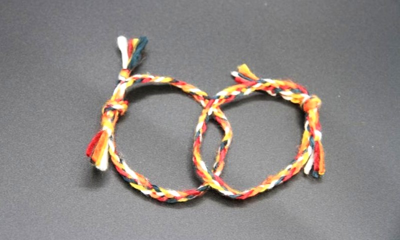 材料は繭から取った絹糸です。この地域でも一時養蚕業が盛んに行われた歴史があり、絹糸は身近なものとなっていました。作り方は織り編み方法で5本の絹糸を使用します。4本が縦糸・1本が横糸、下・上・下・上の繰り返しで作品作りをしています。織り方に個性があり、素敵なミサンガが出来ています。