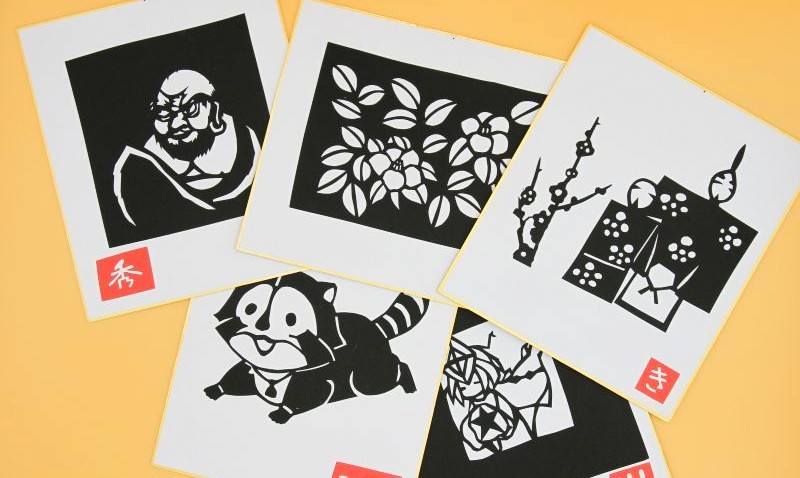 切り絵は、主に黒い紙を切り抜いて絵を表現するもので、黒と白のコントラスト(力強い印象)と切り口の独特な形が魅力です。体験学習では、用意した7種類程の絵柄から自分の好みと技量に合わせて自由に絵柄を選択します。使用する道具は、カッターナイフとゴムマットおよびスプレー糊で、切り抜いた絵柄を色紙に張り付けて作品が完成します。