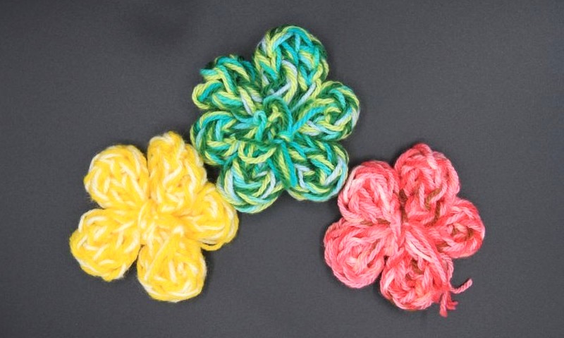アクリル毛糸を使って指編みでリリアン編みをして作ります。ひも状に編んでから花形を作ります。大きさや形は自由に作れますが、教室では長さを決めて作っています。。作業では花形に編むころが難しそうです。そんな中、何回もやっていると早く編めるようになり、形も整ってかわいいエコたわしになっています。
