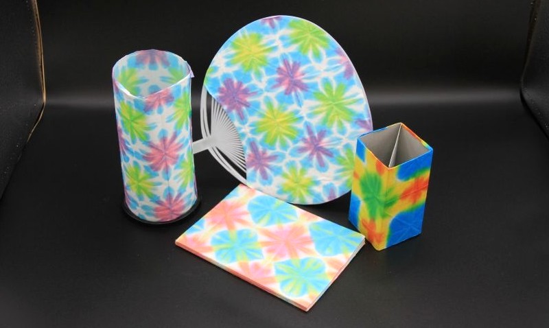 「折り染め」は、障子紙のような和紙を折りたたんで染料で染めるものです。和紙の折り方や染め方によって様々な模様を作り出すことができます。体験学習では、出来た折り染めを使い、ノートの表紙づくりや団扇、箱などに貼ることで日常で使えるものに仕上げています。