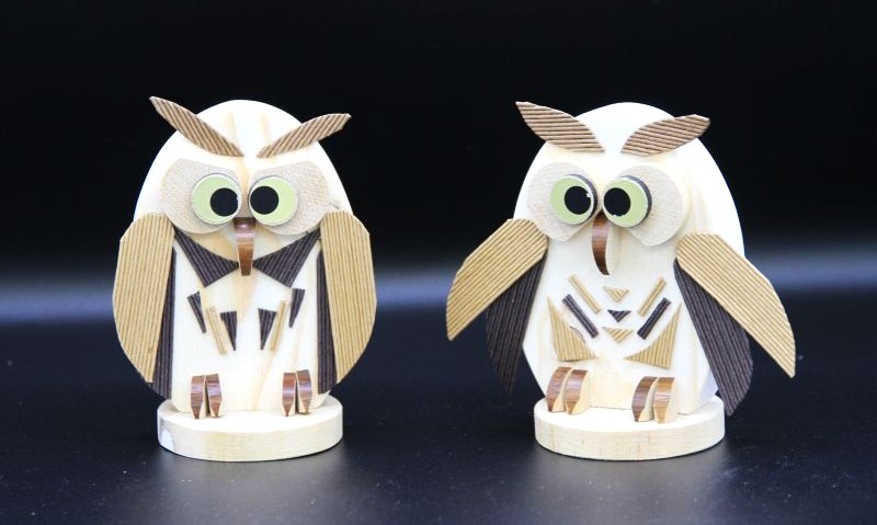 木製のフクロウの置物を作っています。フクロウは福を呼ぶまたは知恵をもたらすなど縁起の良いものとされ、多くの人に好まれています。体験学習では、使用する木材の性質を理解しながら、木材を加工・細工する時、面取りという工程が大切であることを体験しています。作品にはそれぞれ個性が現れて、手作り感を充分楽しんでいます。