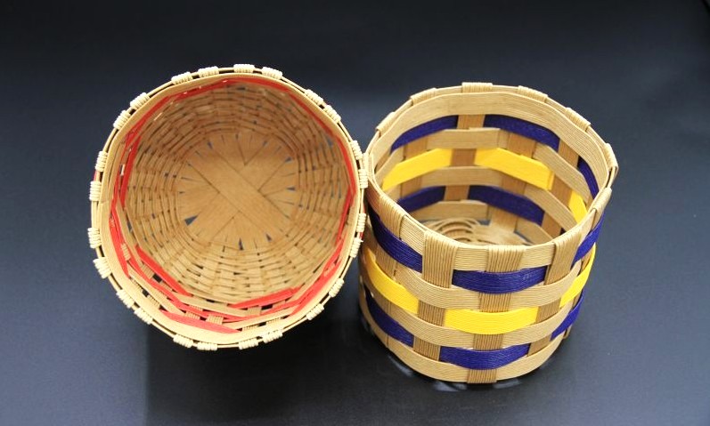 材料は、牛乳パック・段ボール・新聞紙などを素材に細いこより状に12本平たく束ねた紙バンドで、手軽に切ったり、割いたり、貼ったりすることができます。体験学習では、丸い入れ物を作っています。基本の色の他に色物を3本混ぜて織り込んでいくので、色の組み合わせによって個性が出るのも楽しみです。