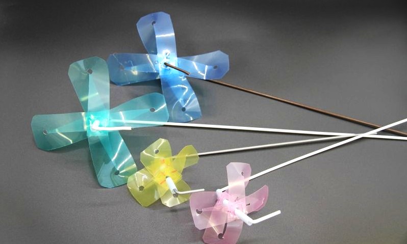 羽根にカラーのクリアーファイルを、中心の回転部分には、針金ハンガーとストローを利用するなど身近に手に入るような材料を使用しています。羽根の切込みの角度や中心部分に羽根を丸めていくところが難しい作業になります。完成後は、教室内に設置した扇風機を使ってどのくらいスムーズに回転するか確認しています。