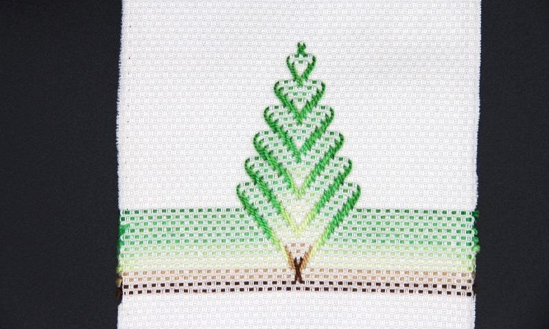 体験学習では、久家道子さんが考案・発表した技法を取り入れています。特徴は、二重に浮き織りされた専用の布を使い、縦糸の織り目の下を先の曲がった針ですくうように糸を通して様々な模様を表現できることです。作品の「マイツリー」は“伸びる”をコンセプトにした図案です。