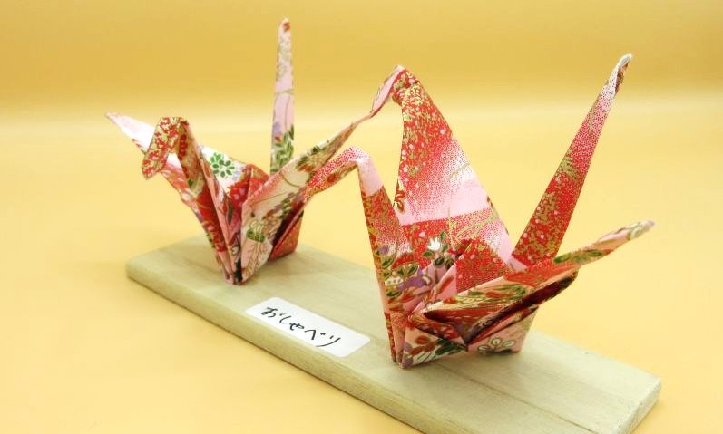 1枚の和紙を使って複数の折り鶴をつないだのが「連鶴」と呼ばれるものです。そして、京友禅の和紙を使ったものが「京連鶴」です。「連鶴」のつなぐ所は、羽根と羽根・くちばしと羽根・くちばしとくちばし等がありますが、体験学習では羽根と羽根をつなげた「おしゃべり」という作品を作っています。
