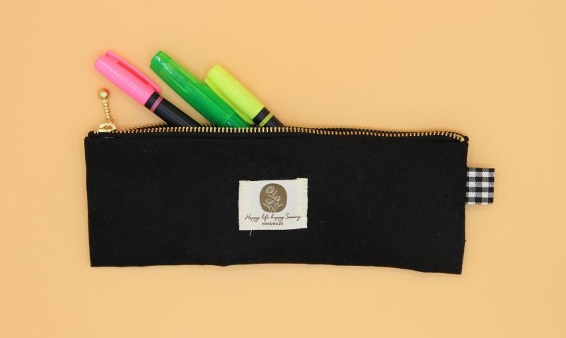 布を使ってファスナー付きペンケースを作っています。本体は強力両面テープで仕上げています。同じ素材の中でも作品に個性を出すために、色とりどりのタグや数々のラベルを用意しています。これらは、裁縫体験として手縫いで付けることになります。
