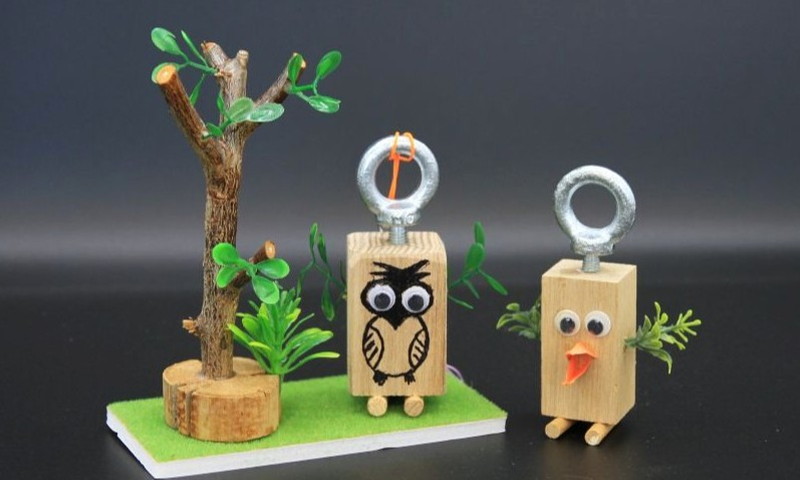 バードコール(別名「鳥笛」)は、木と金属の摩擦音で、小鳥のさえずり・鳴き声に 似た音を出すものです。その仕組みは、木に開けた穴にアイボルトを差し込み、細かく締める緩めるの動作を繰り返すことで音がでます。作り方は立方体のタモ材に穴を開けタップでネジ穴を開けアイボルトをねじ込んでいきます。